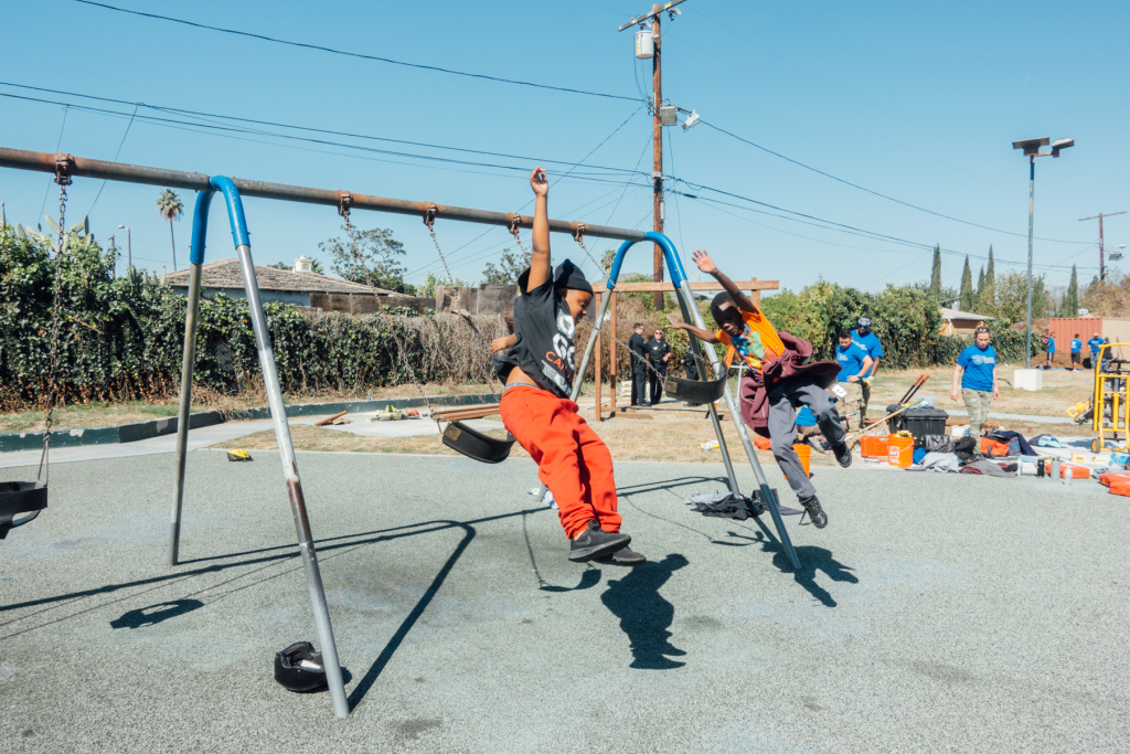 Fun on the swing set at Gonzaque Village in Watts during the Mission Continues service platoon event on Saturday, February 24th, 2018.