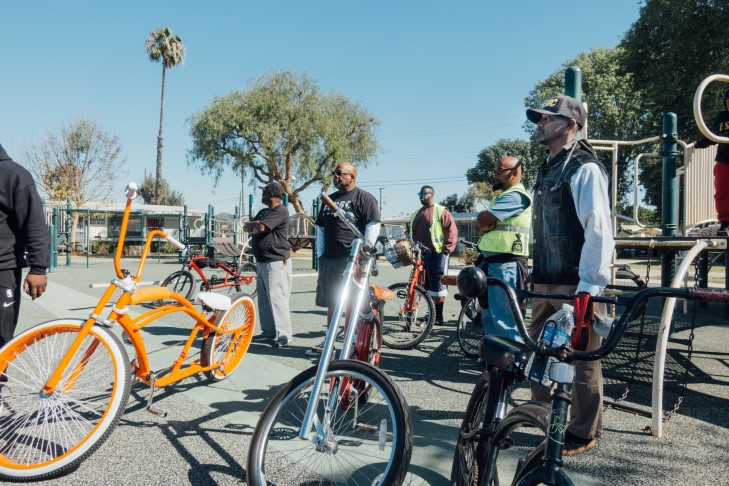 Los Riders and East Side Riders Bike Club stop by during the Mission Continues playground beautification project at Gonzaque Village in Watts